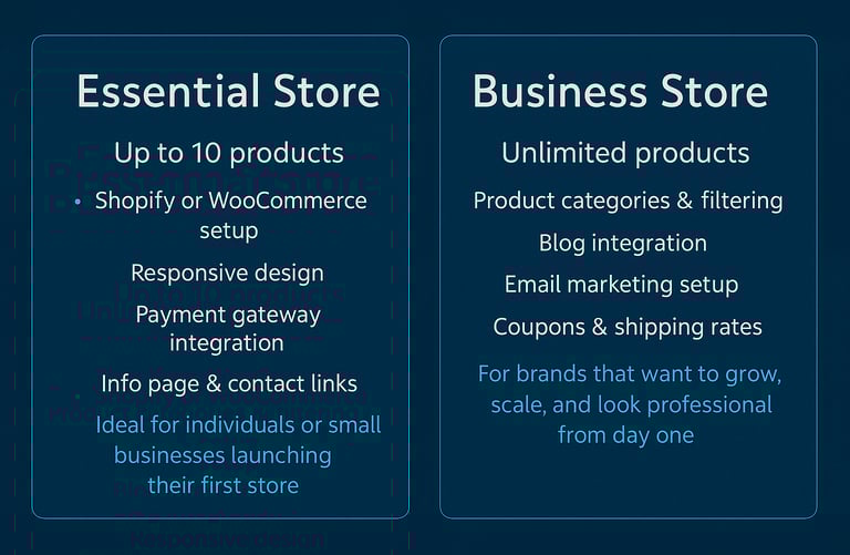 Eksploroni paketat tona thelbësore dhe të dyqaneve të biznesit, të dizajnuara për suksesin tuaj online.