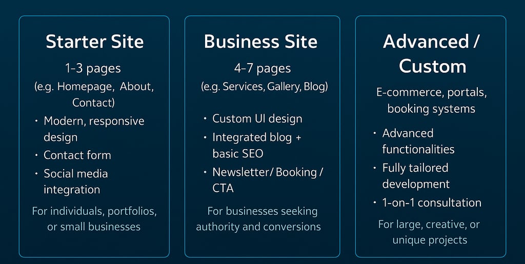 Custom, fast, and mobile-friendly websites designed for small and medium-sized businesses. Choose your perfect package!